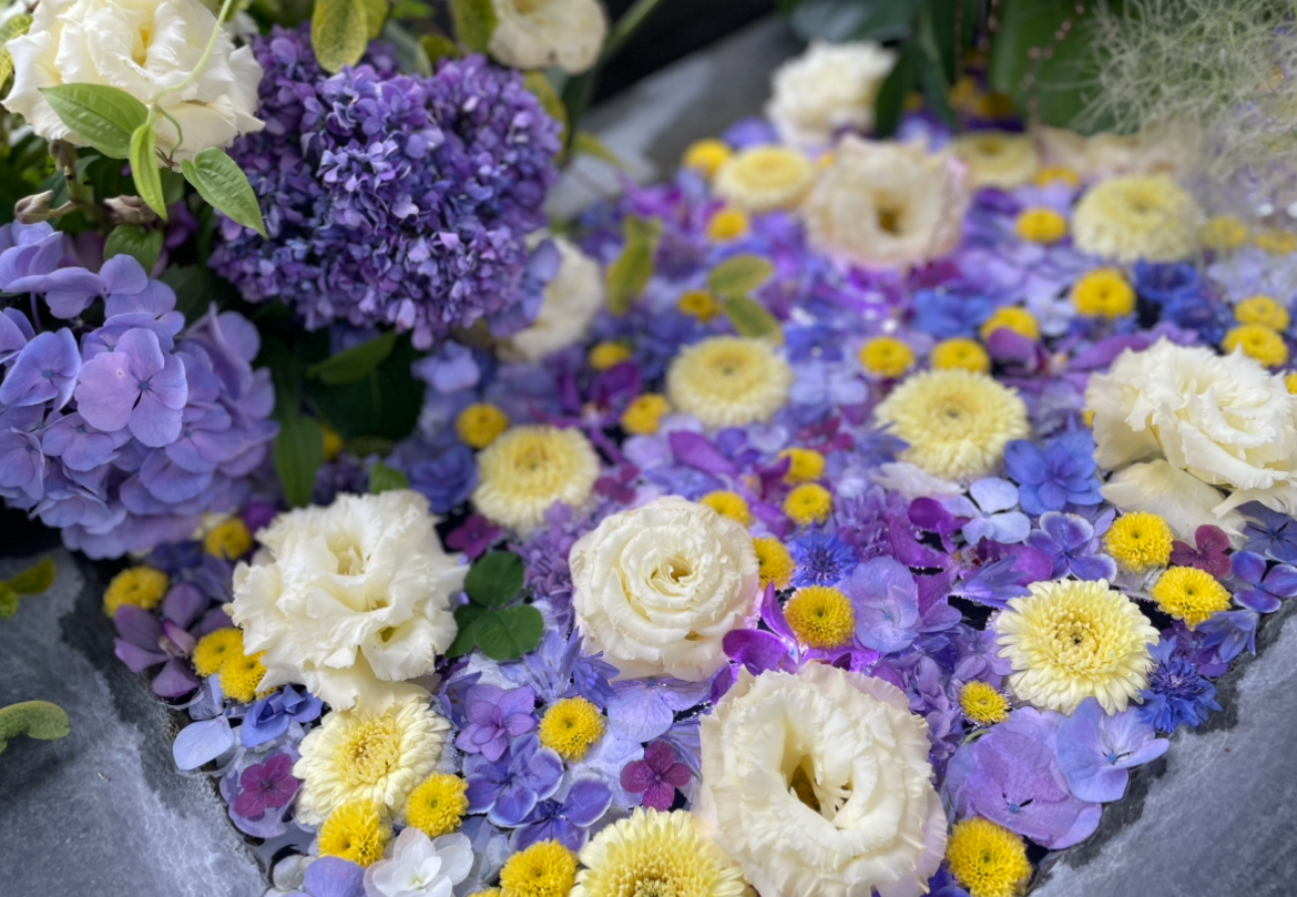 花手水とは、手や口を清めるために設けられた神社や寺院の手水舎の手水鉢に浮かべられた色とりどりの花を意味します。
