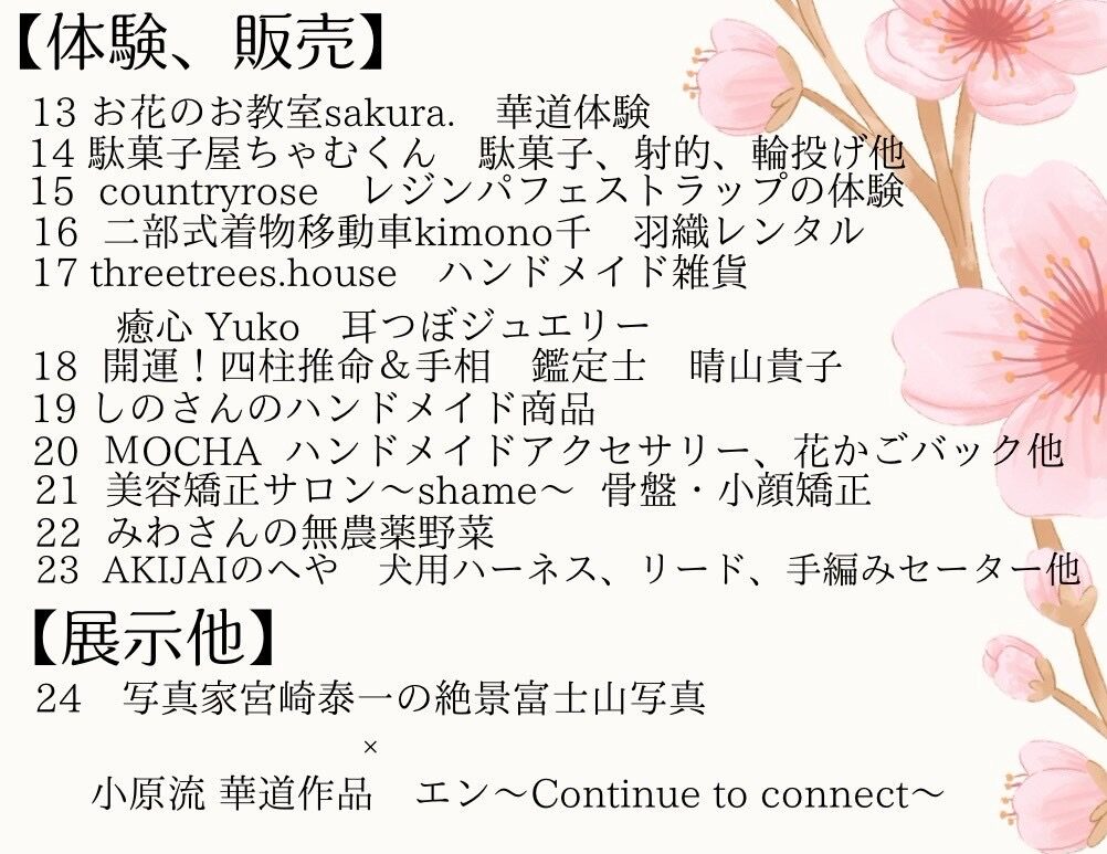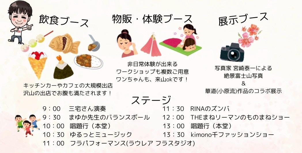 飲食、物販&体験、作品展示、フリーマーケット、ステージ等の催しがあります。
