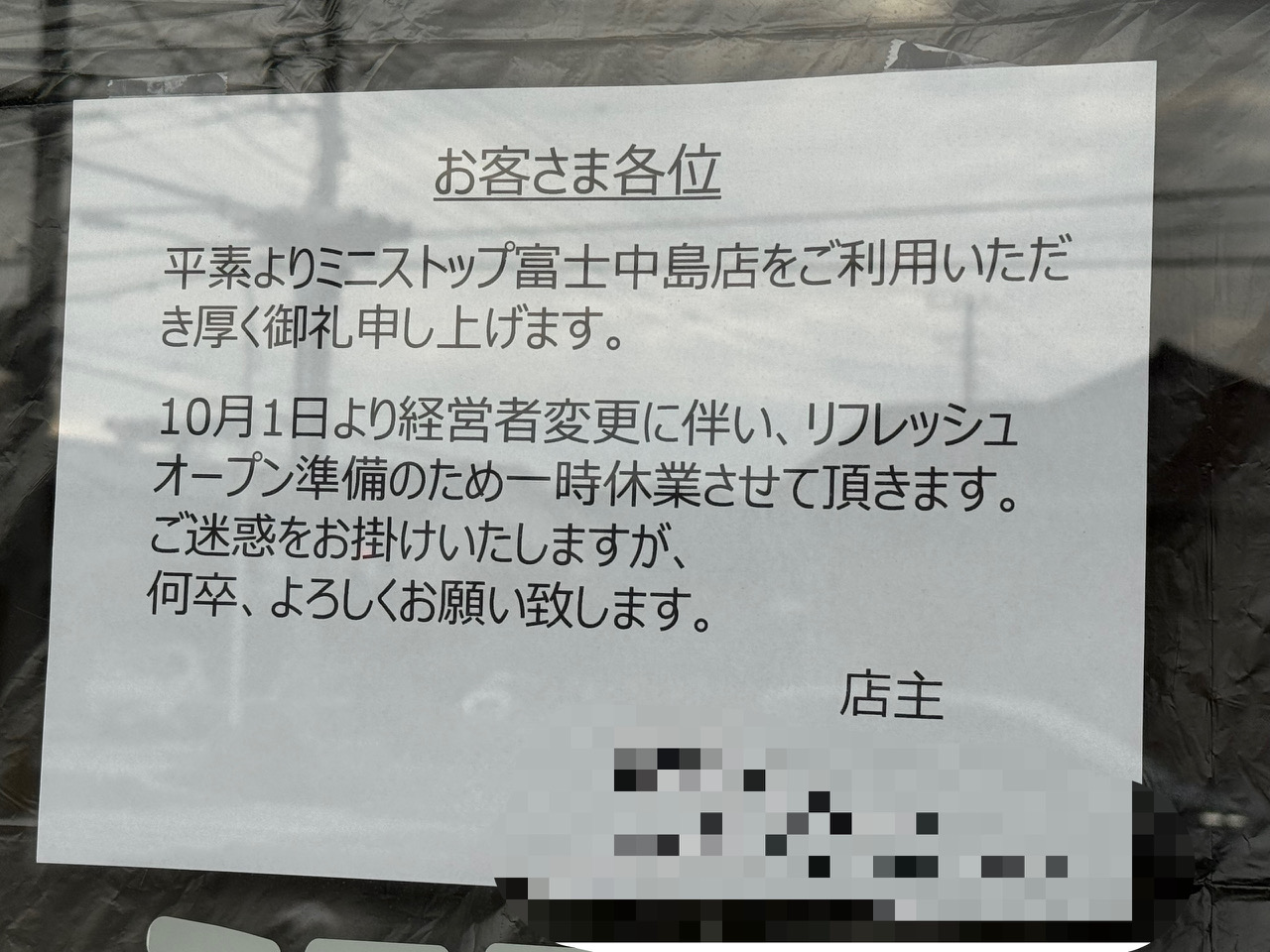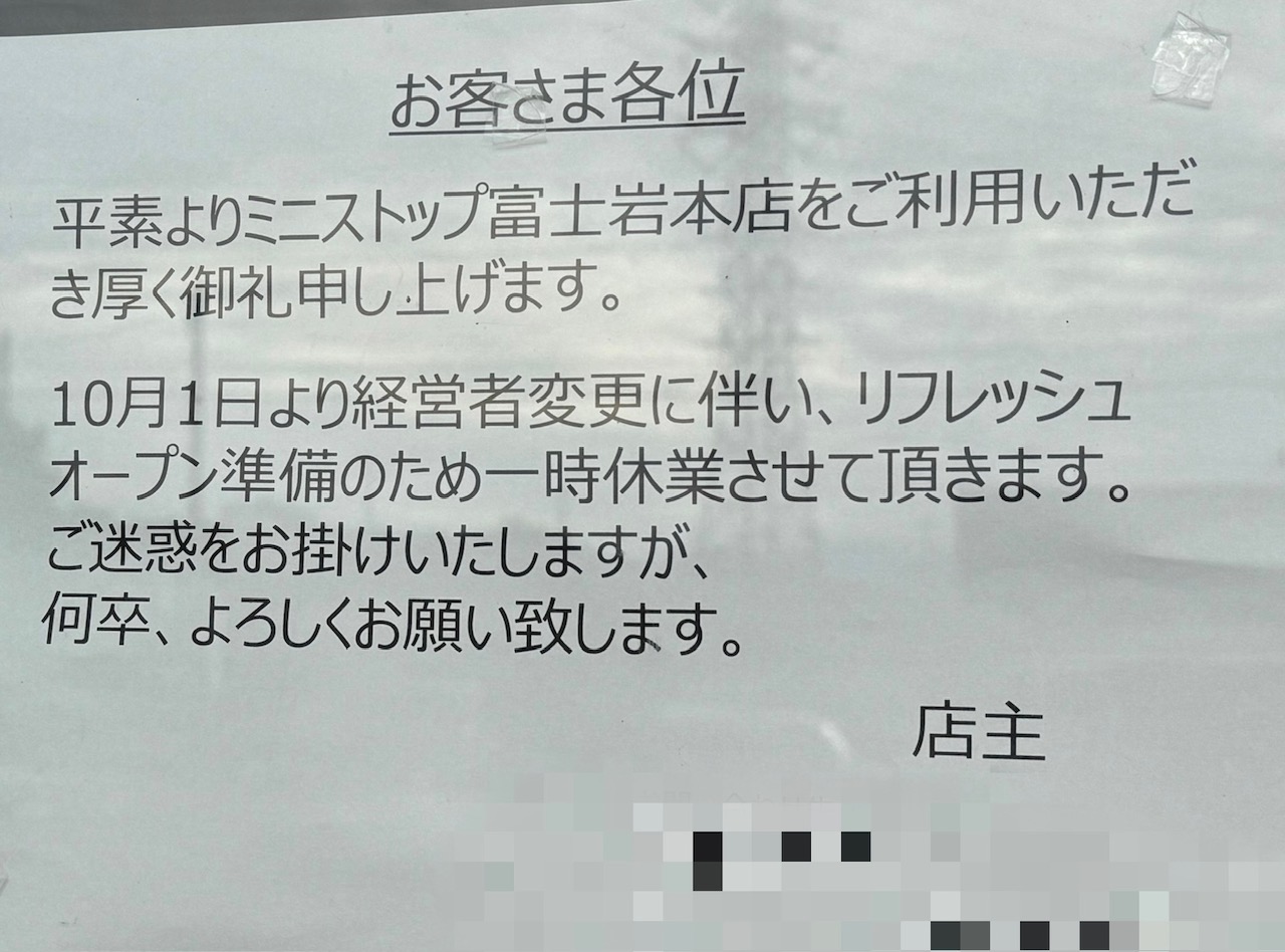 平素よりミニストップ富士中島店をご利用いただき厚く御礼申し上げます。10月1日より経営者変更に伴い、リフレッシュオープン準備のため、一時休業中させて頂きます。ご迷惑をお掛けいたしますが何卒、よろしくお願い致します。と掲示がありました。