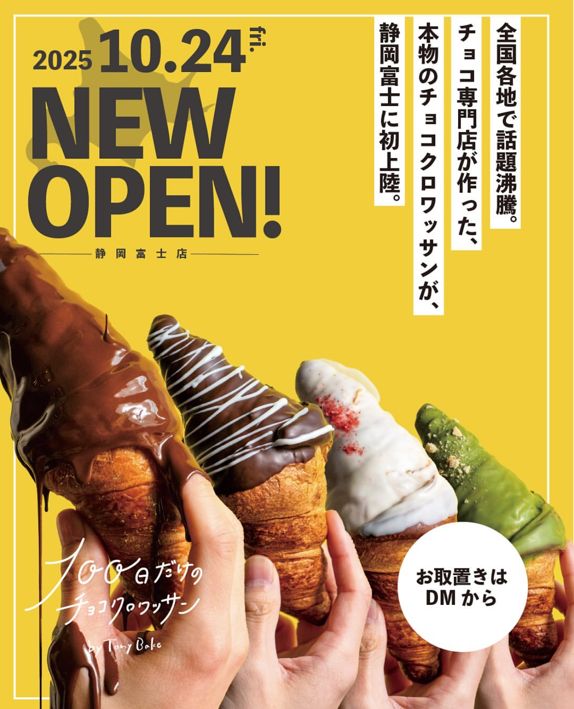 チョコクロワッサン専門店「100日だけのチョコクロワッサンbyTonyBake(トニーベイク)静岡富士店」が2025年10月24日(金)にオープンします!北海道発祥のチョコが売っていないチョコ専門店「TonyBake」が手掛ける「チョコクロワッサン専門店」が静岡県富士市に初上陸!