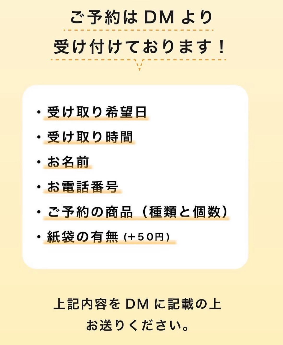 受け取り希望日・受け取り時間・名前・電話番号・予約商品(種類と個数)・紙袋の有無(+50円)の内容をDMに記載の上、送信してください。