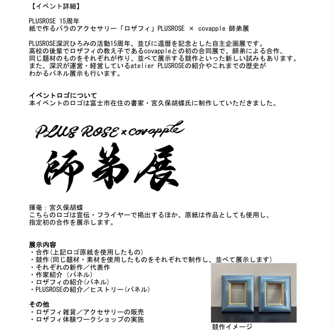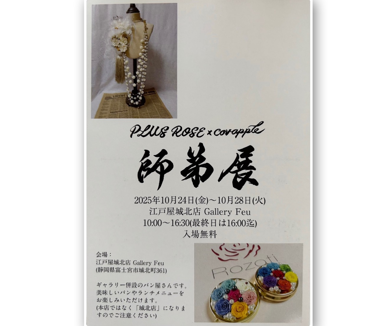 「PLUSROSE × covapple師弟展」10月24日(金)~28日(火)10:00〜16:30 ※最終日のみ10:00〜16:00