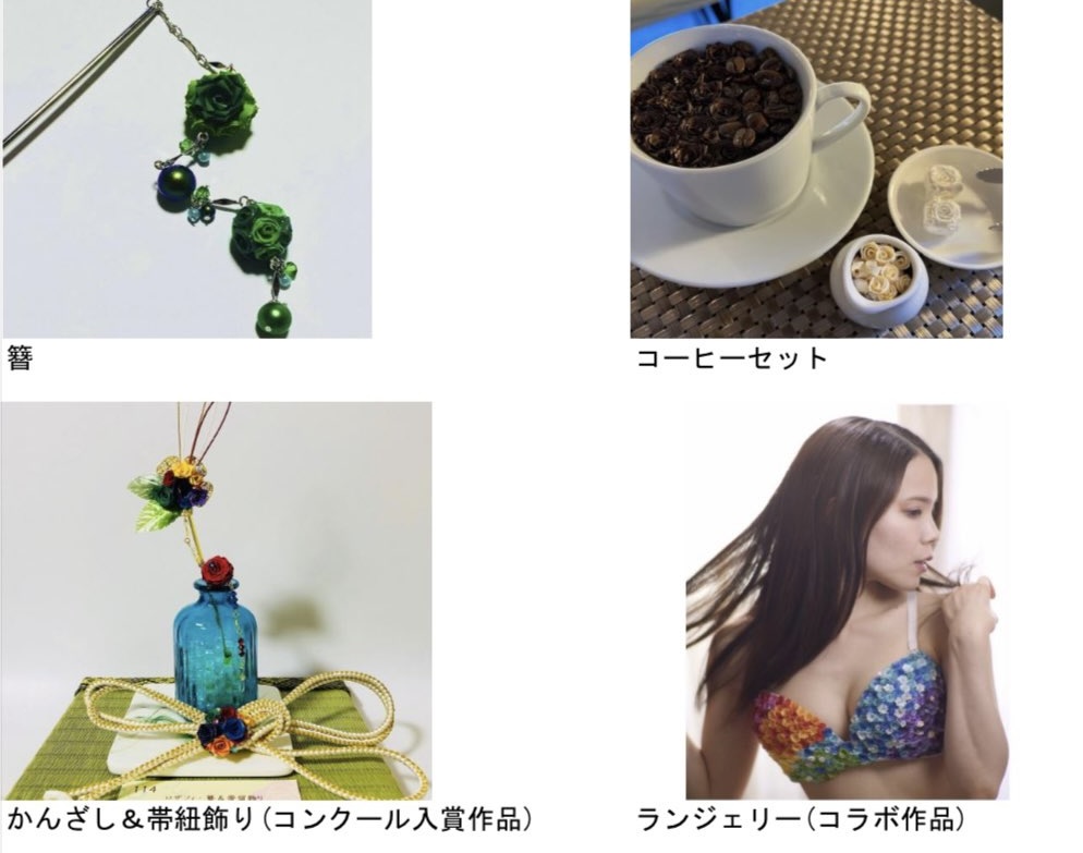 作品は、ピンク系ホワイト系の色使いをメインに作風は「アンティーク調」、「ロリィタ系」、「和風」。