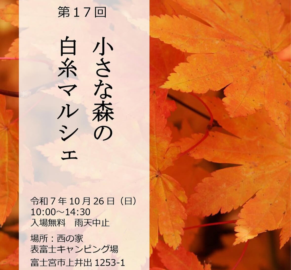 2025年10月26日(日)「第17回小さな森の白糸マルシェ」が上井出の「西の家 表富士キャンピング場」にて開催されます。
