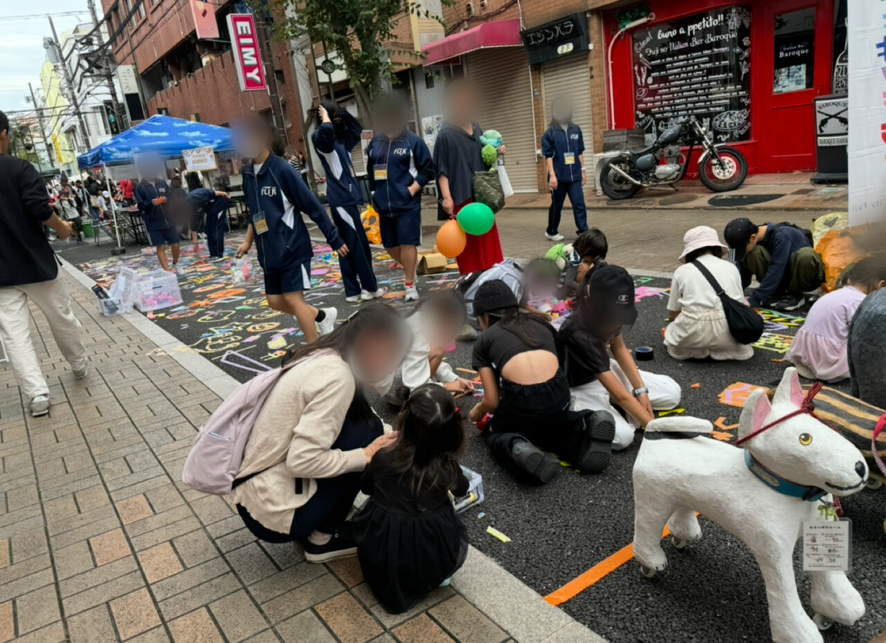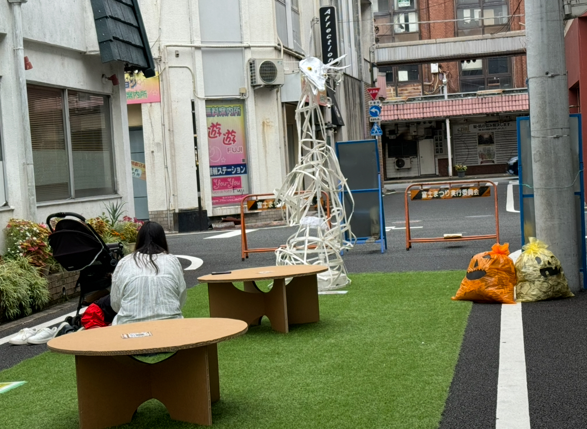 道路に椅子やテーブル・人工芝を設置して普段とは異なる屋外空間で、ゆったりとくつろげるようになっています。
