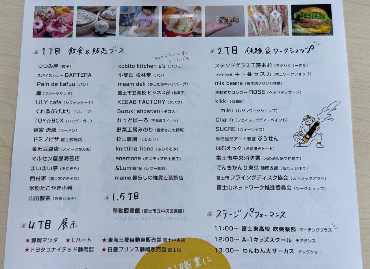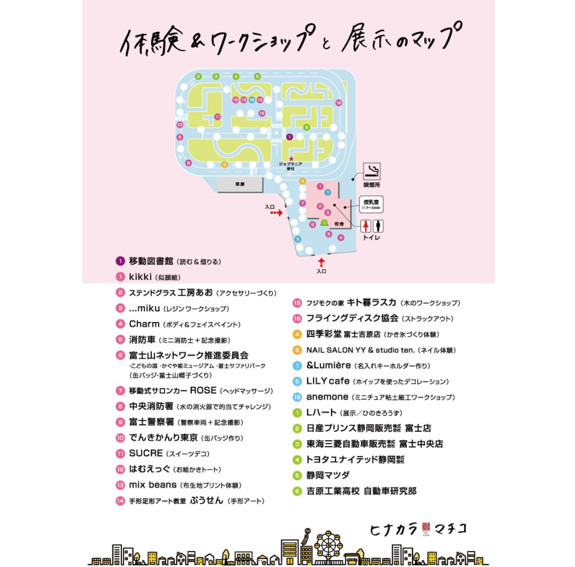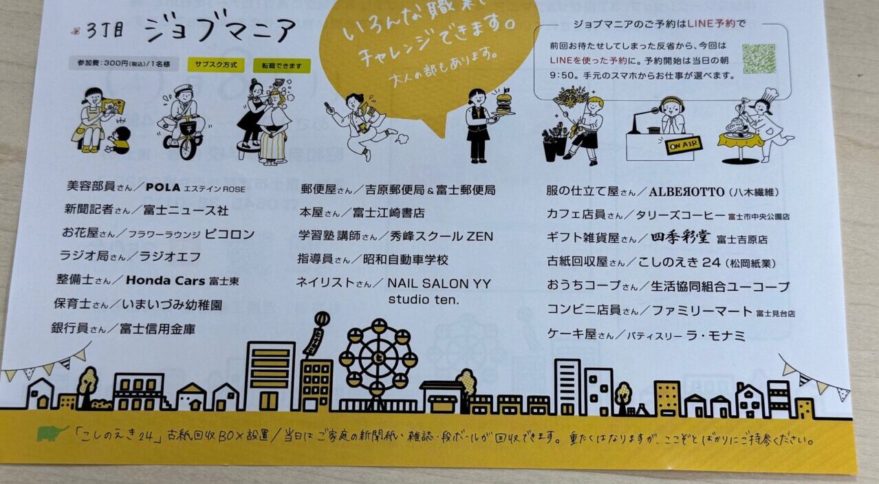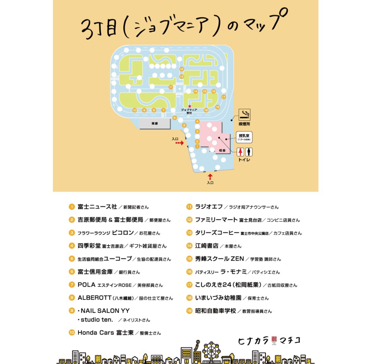 3、フラワーラウンジ ピコロン/お花屋さん8、ALBEROTTO(八木繊維)/服の仕立て屋さん 12、ファミリーマート 富士見台店/コンビニ-店員さん 13、タリーズコーヒー 富士市中央公園店/カフェ店員さん 15、秀峰スクールZEN/学習塾講師さん 18、いまいづみ幼稚園/保育士さん