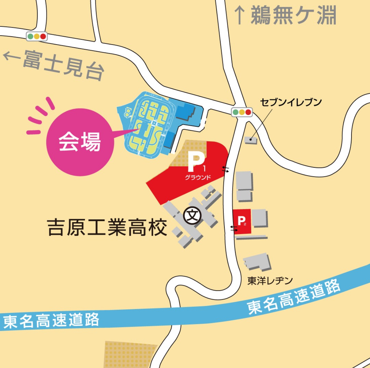 駐車場は2ヶ所あります。P1の吉原工業高校グラウンドには300台以上駐車可能です。