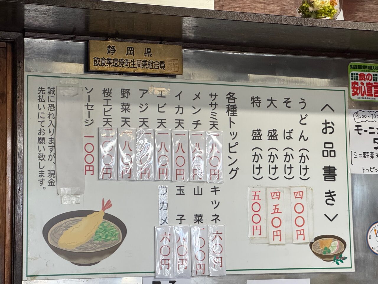 メニューはうどん・そば、天ぷらトッピング、たまご(月見・煮・ゆで)・新米のごま塩おにぎりなどがあります。