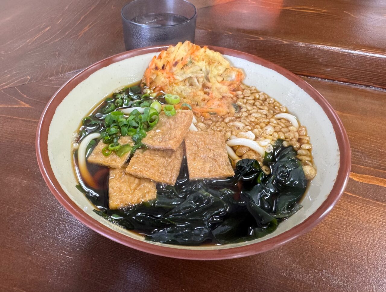 こちらが「モーニングうどん」並サイズです。きつね、ミニ天ぷら、わかめが入って550円とコスパ最高です。大盛・特盛にサイズ変更もできます。