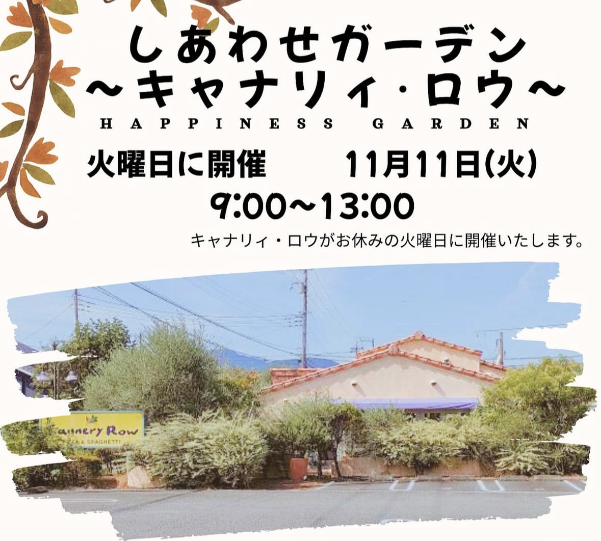 「しあわせガーデン」というマルシェの名前の由来はキャナリィ・ロウさんのお客様に“おいしかった、楽しかった”という「幸せ」を提供していきたい。そして人々をやさしく、温かく、幸せを感じていただきたい。という思いをそのまま私達も引き継いで皆様に「幸せ」を感じて欲しいと思いこのイベント名にさせて頂きました!(Instagramより)