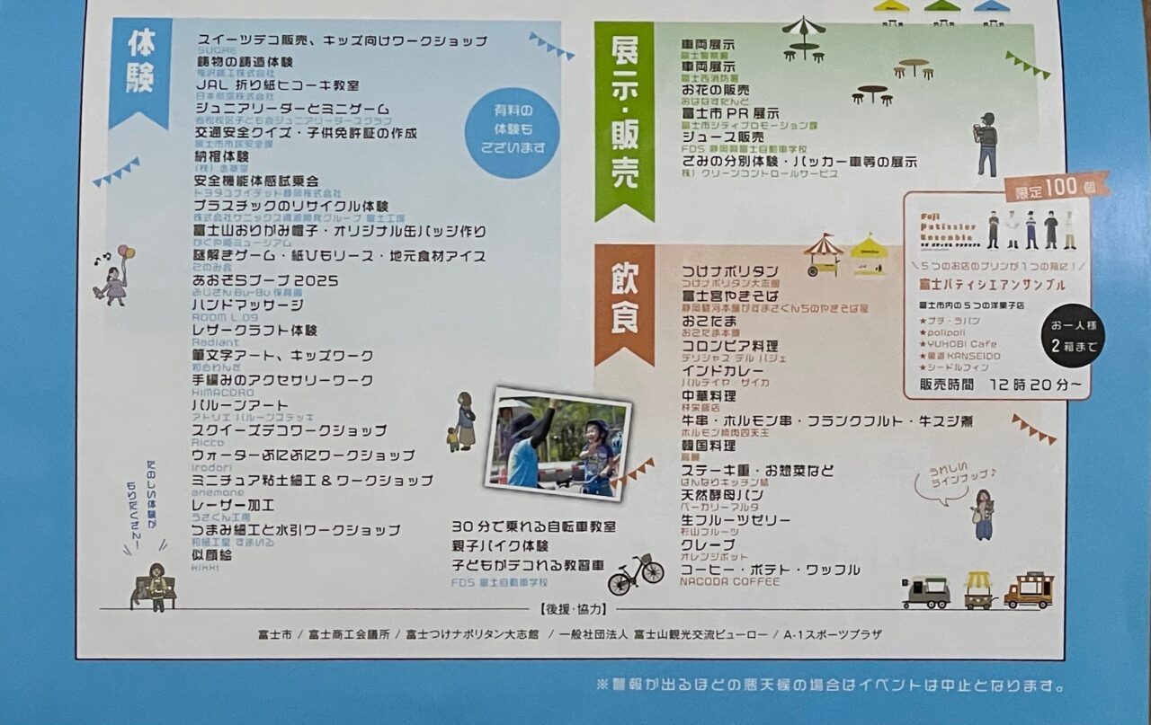 飲食の出店は「富士つけナポリタン」、「富士宮焼きそば」のご当地グルメ。コロンビア料理、インドカレー、中華料理、牛串、ホルモン串、フランクフルト、牛すじ煮、韓国料理、ステーキ重、お惣菜、天然酵母パン、生フルーツゼリー、クレープ、コーヒー、ポテト、ワッフルなどの出店があります