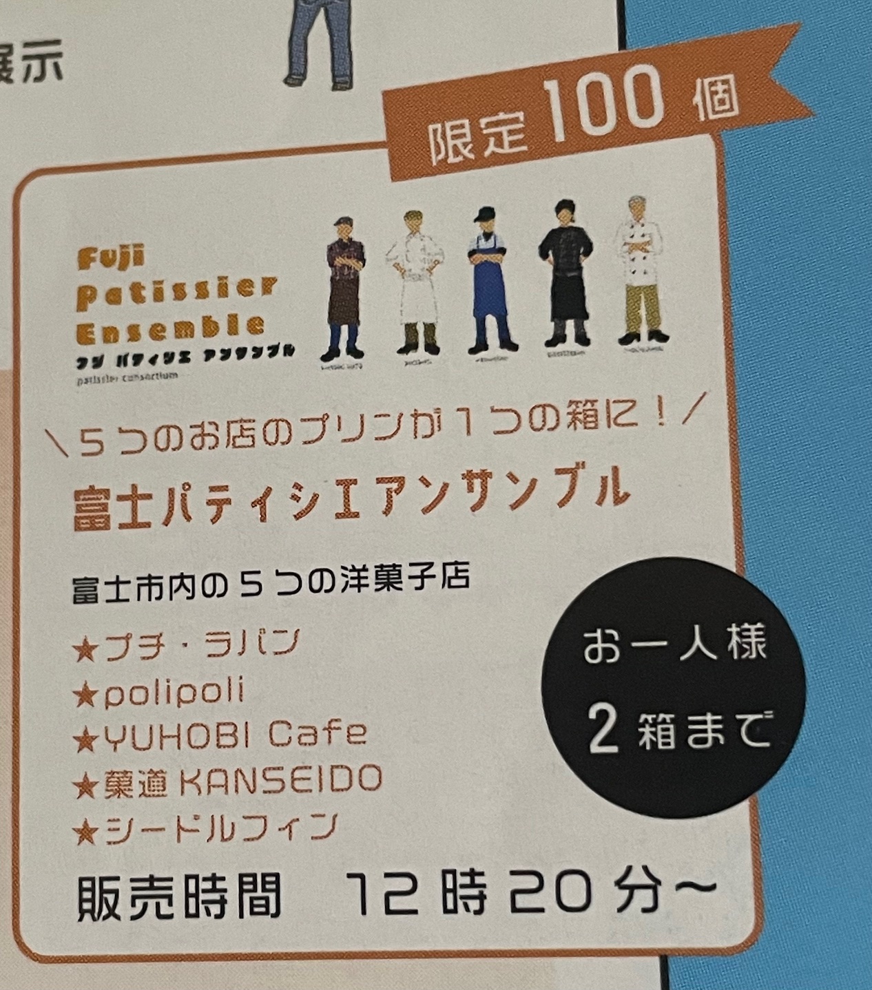 吉原アーケードマーケットで人気の「富士パティシエアンサンブル」のプリンが販売されます。市内の有名洋菓子店5店舗のプリンの詰め合わせが限定100個販売!