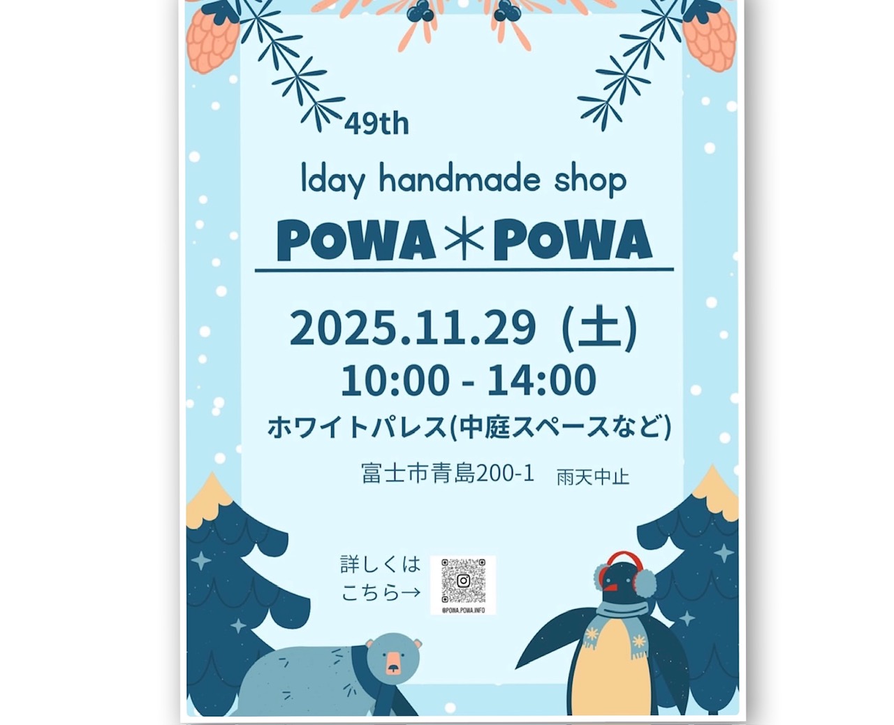 2025年11月29日(土)、ホワイトパレスにて、handmade 1day shop「POWA✳︎POWA」が開催されます。
