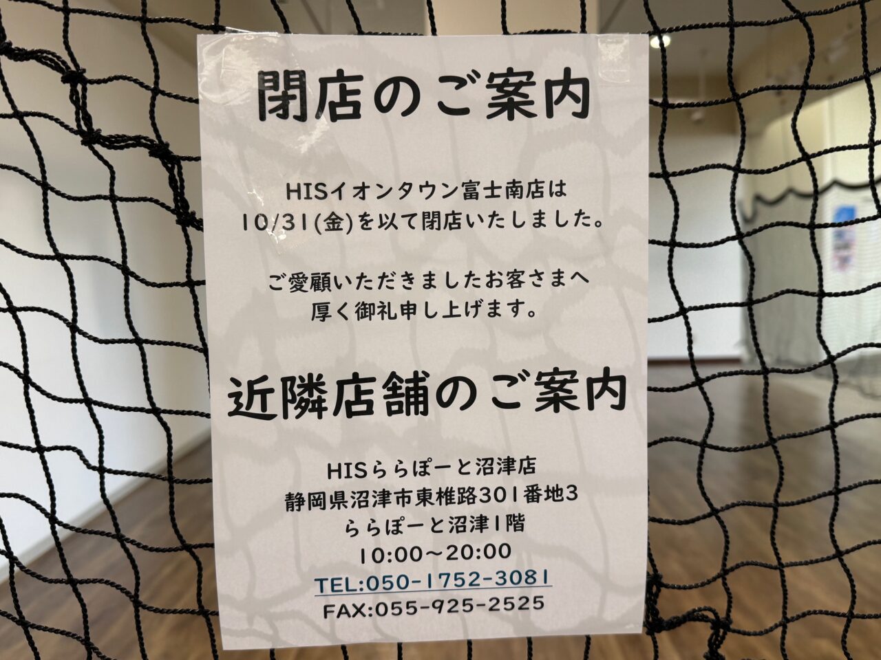 2階にあった「HISイオンタウン富士南店」が閉店していました。