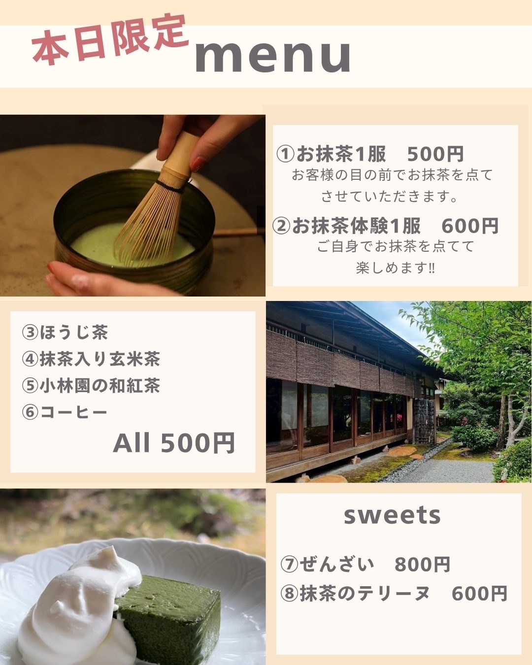 「ほうじ茶・抹茶入り玄米茶・小林園の和紅茶・コーヒー」各種500円