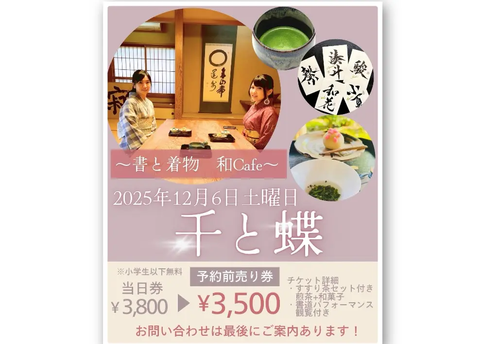 2025年12月6日(土)9:30~12:00に松岡の「小林園」にて「~書と着物 和Cafe~千と蝶」が開催されます。