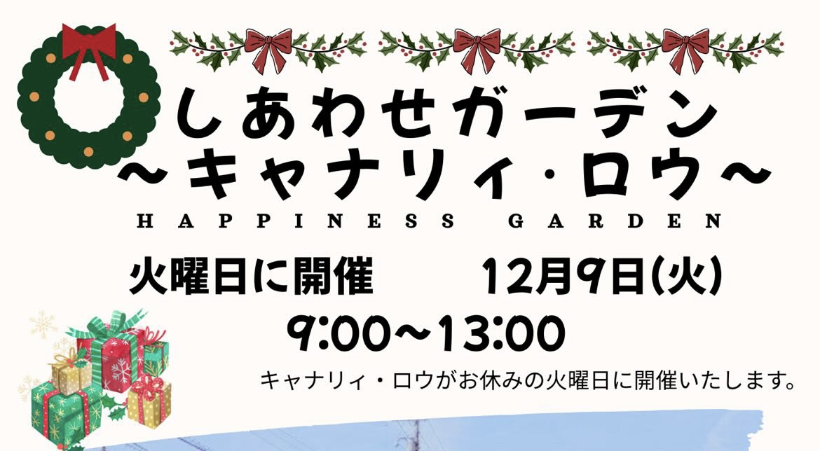 2025年11月に始まった「しあわせガーデン~キャナリー・ロウ」の2回目が12月9日(火)に開催されます。マルシェの名前「しあわせガーデン」の由来は「キャナリィ・ロウ」のお客様に“おいしかった、楽しかった”という「幸せ」を提供していきたい。そして人々をやさしく、温かく、幸せを感じていただきたい。という思いをそのまま私達も引き継いで皆様に「幸せ」を感じて欲しいと思いこのイベント名にしたそうです。