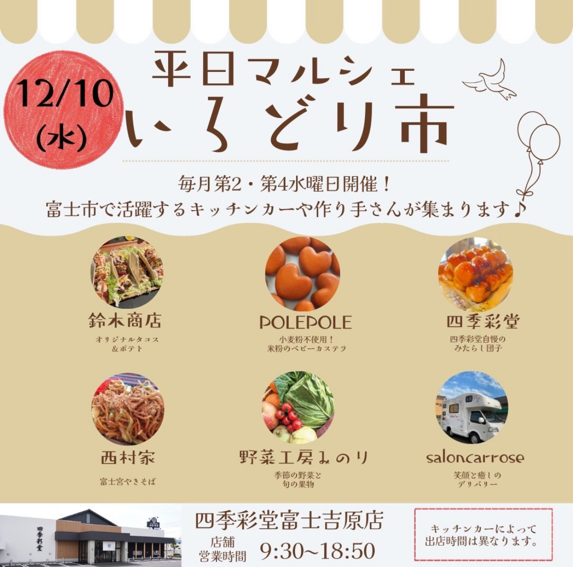 2025年12月10日(水)は「四季彩堂富士吉原店」の駐車場にて「いろどり市」が開催されます。