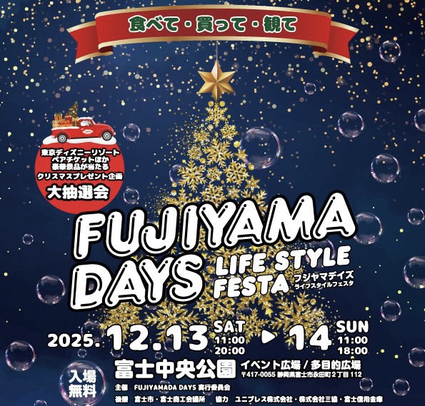 2025年12月13日(土)・14日(日)は世界のグルメとイルミネーションのイベント「FUJIYAMADAYS」が富士市中央公園にて開催されます。