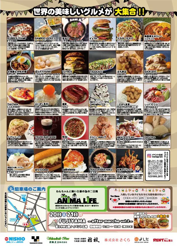 「FUJIYAMADAYS」は、富士市で世界のグルメを堪能できる「食と動物とのふれあい」をテーマにしたイベントです。県内外より選りすぐりのFOODTRUCKが集まり、ご来場いただいた皆様に美味しいグルメと楽しいお買い物や体験等々、わんちゃん連れのお客様も一緒に楽しめるエンターテイメントをお届けします!(公式HPより)