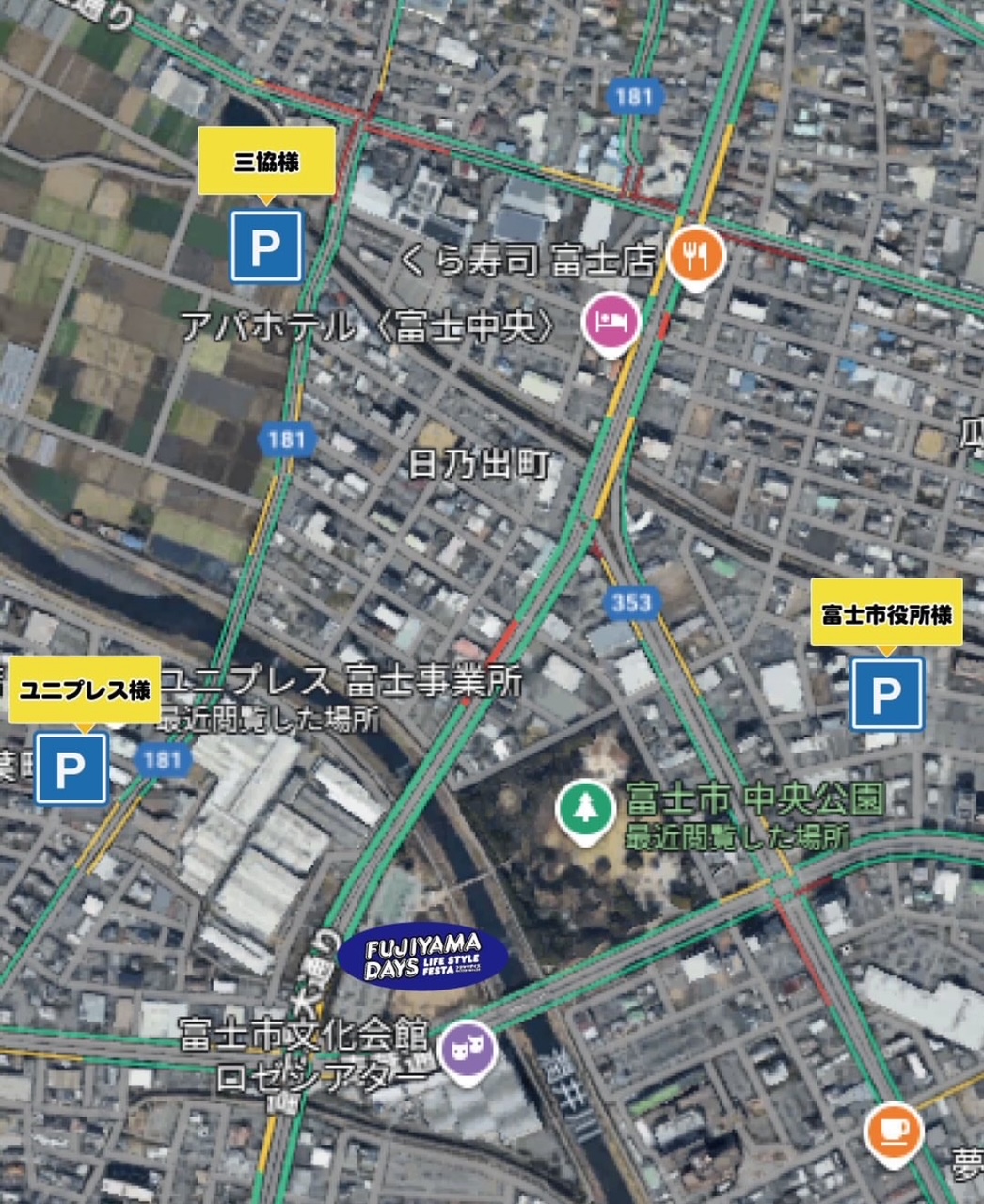 臨時駐車場は「三協」「富士市役所」「ユニプレス」の3ヶ所です。