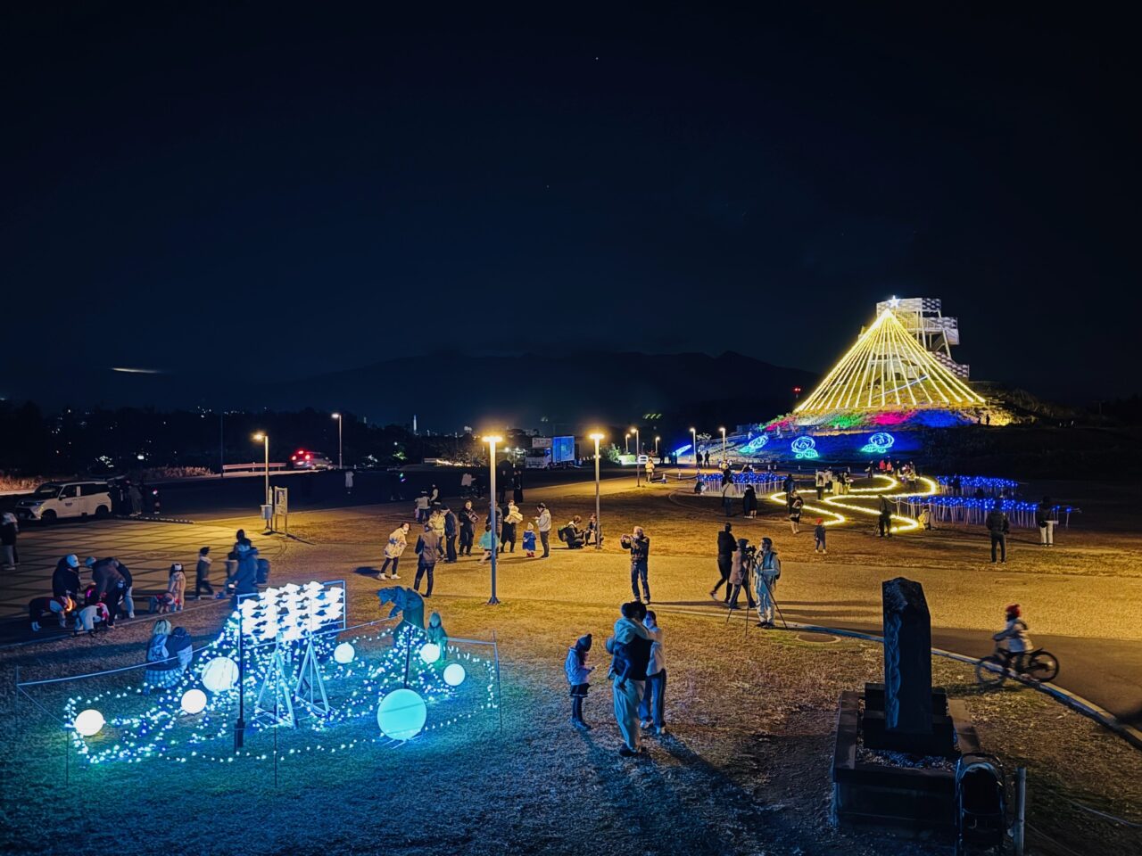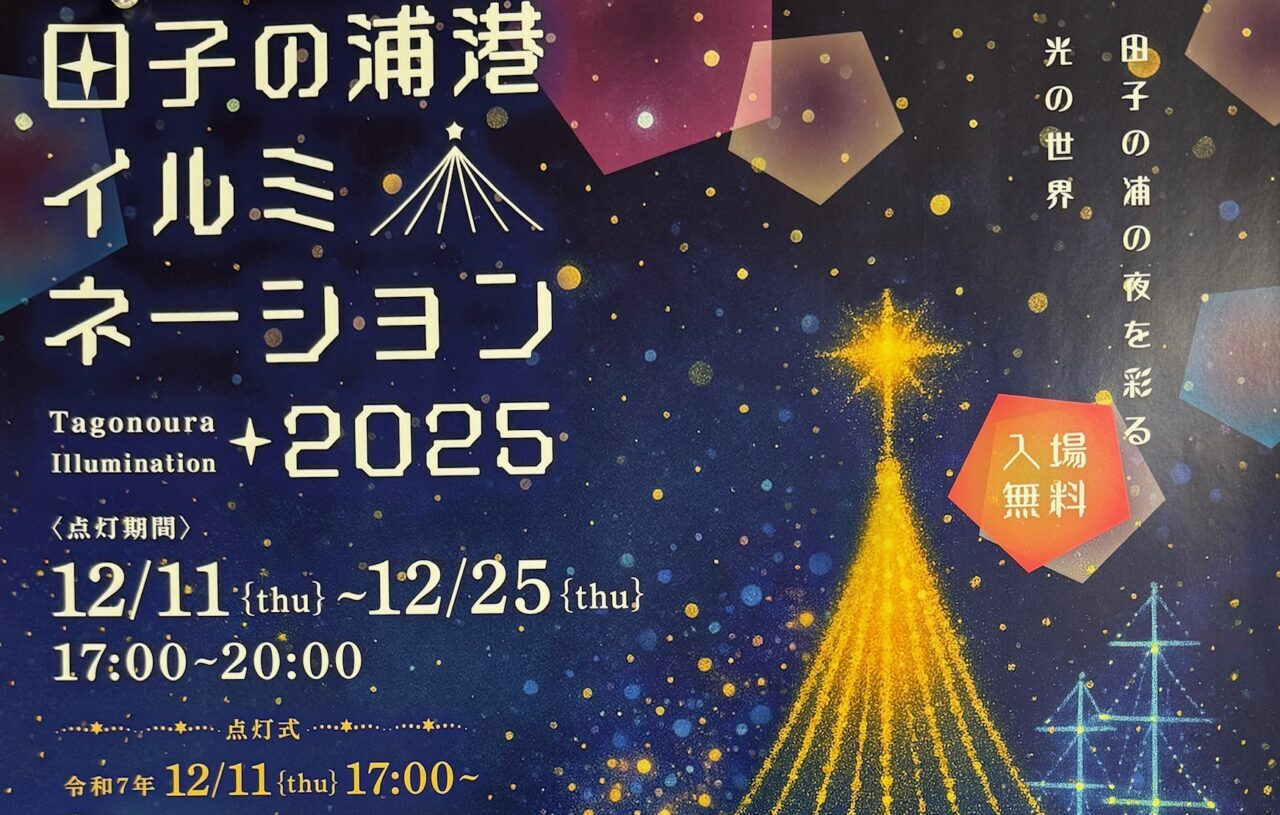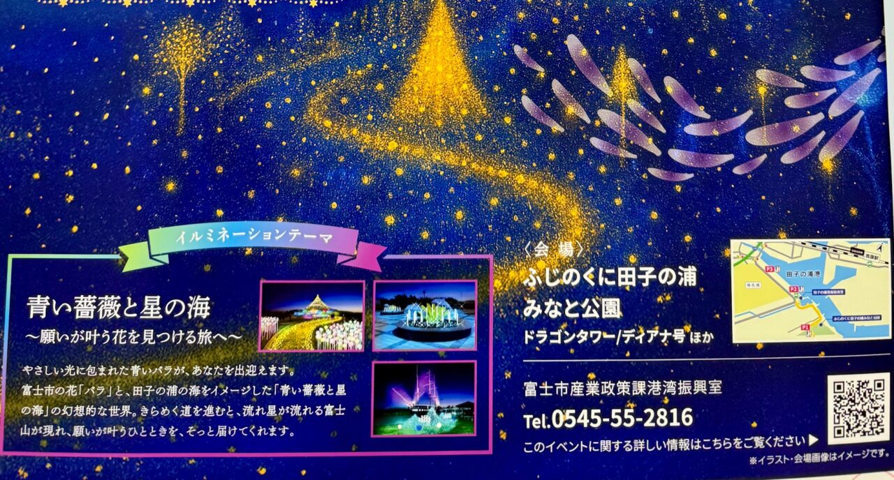 2025年12月11日(木)~25日(木)まで、田子の浦港プロムナードエリア(田子の浦港漁協食堂からふじのくに田子の浦みなと公園まで)で「田子の浦港イルミネーション2025」が開催されています。「田子の浦港プロムナードゾーン」を中心に田子の浦港のにぎわいづくりを進めているイベントの一環です。昨年から始まったこのイベントは大好評でにぎわいました。