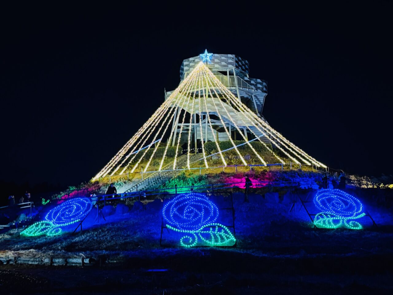 2025年のイルミネーションのテーマは「青い薔薇と星の海~願いが叶う花を見つける旅へ~」やさしい光に包まれた青いバラが、あなたを出迎えます。富士市の花「バラ」と田子の浦の海をイメージした「青い薔薇と星の海」の幻想的な世界。きらめく道を進むと流れ星が流れる富士山が現れ、願いが叶うひとときを、そっと届けてくれます。