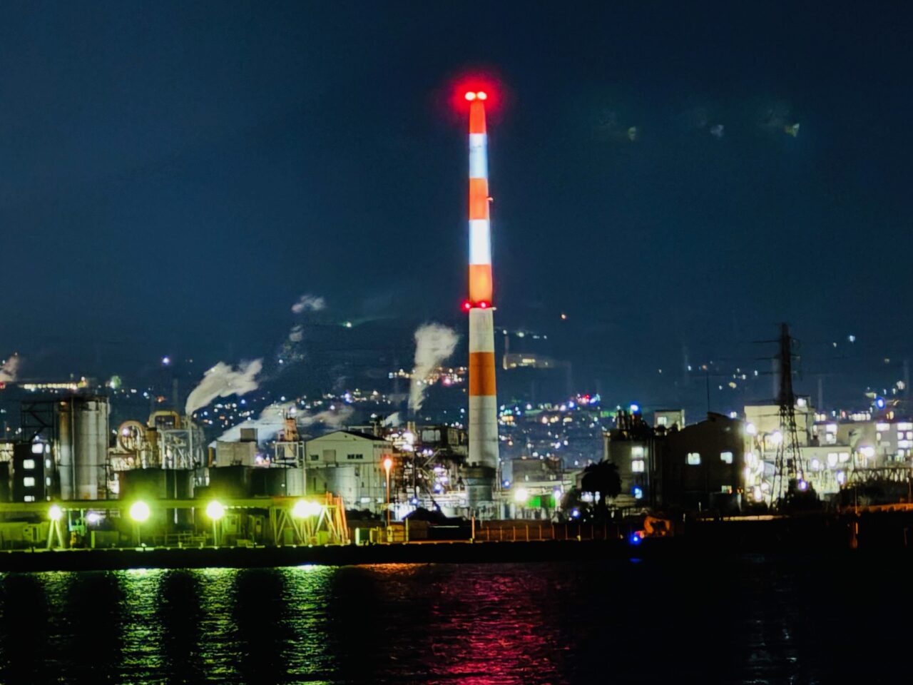 画像の煙突は「日本食品化工富士工場」(富士市田島30)です。「興亜工業株式会社」(富士市比奈1286-2)でもライトアップがされています。詳しくは富士市公式HPをご覧ください。