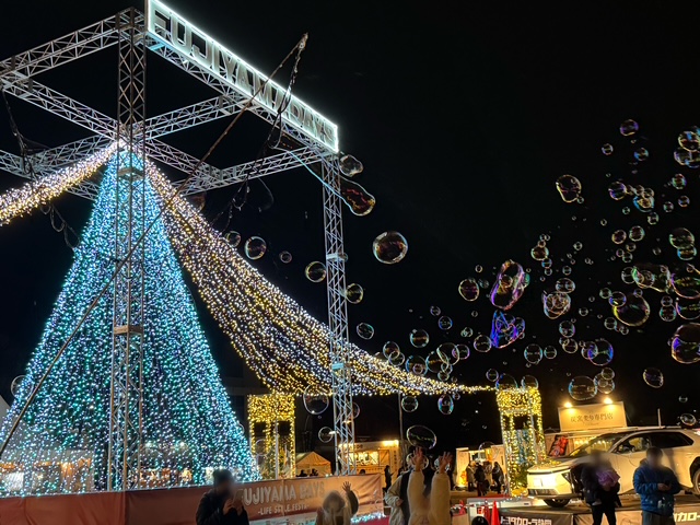 シャボン玉とイルミネーションが美しく皆さんを惹きつけていました。