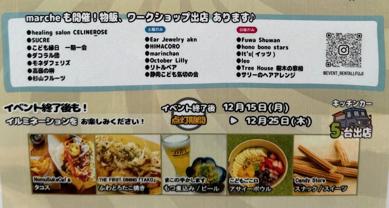 2週目は地元のグルメとマルシェが開催されます。15日~25日までのイルミネーションが点灯している期間、15日~25日まではキッチンカーが出店します。点灯時間は16:30~22:00までの予定です。