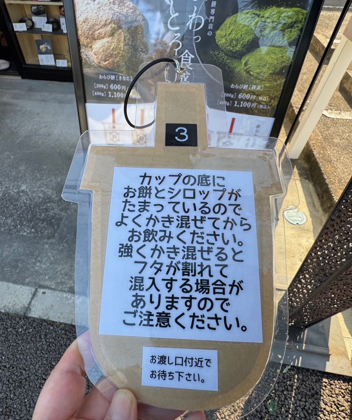 「飲むわらび餅」と「わらび餅」を注文したところ、「わらび餅」は欠品で販売できないとのことで「飲むわらび餅 抹茶ミルク」をお願いしました。