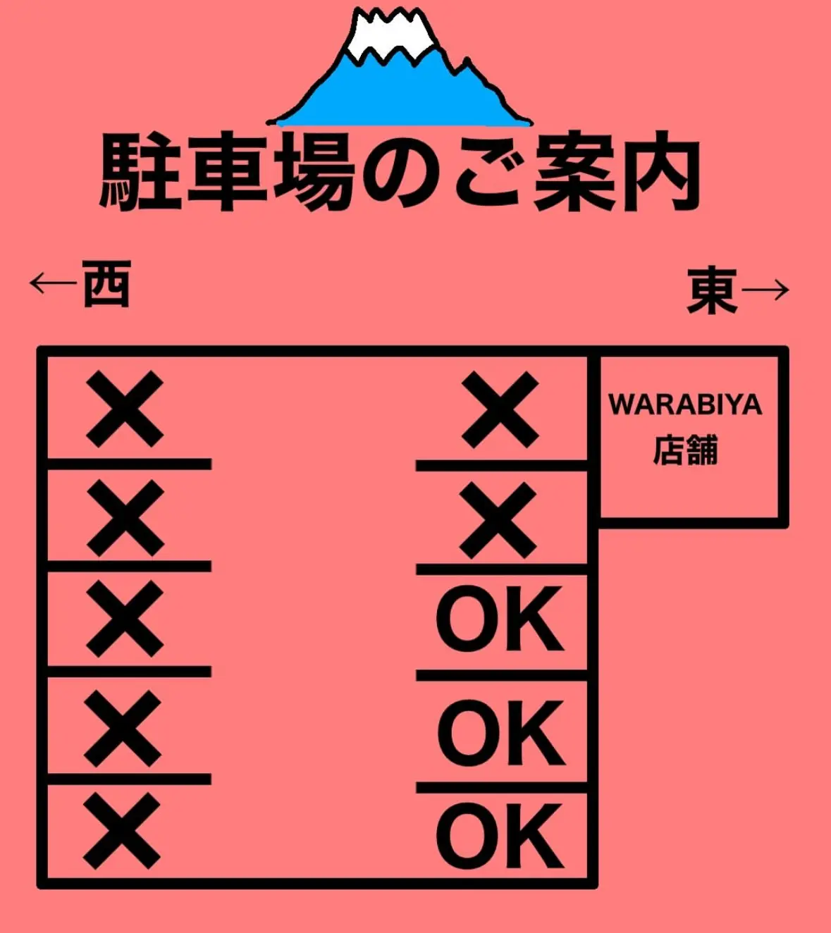 指定場所以外にはとめないでください。満車の際は時間をあらためて来店してくださいね♪