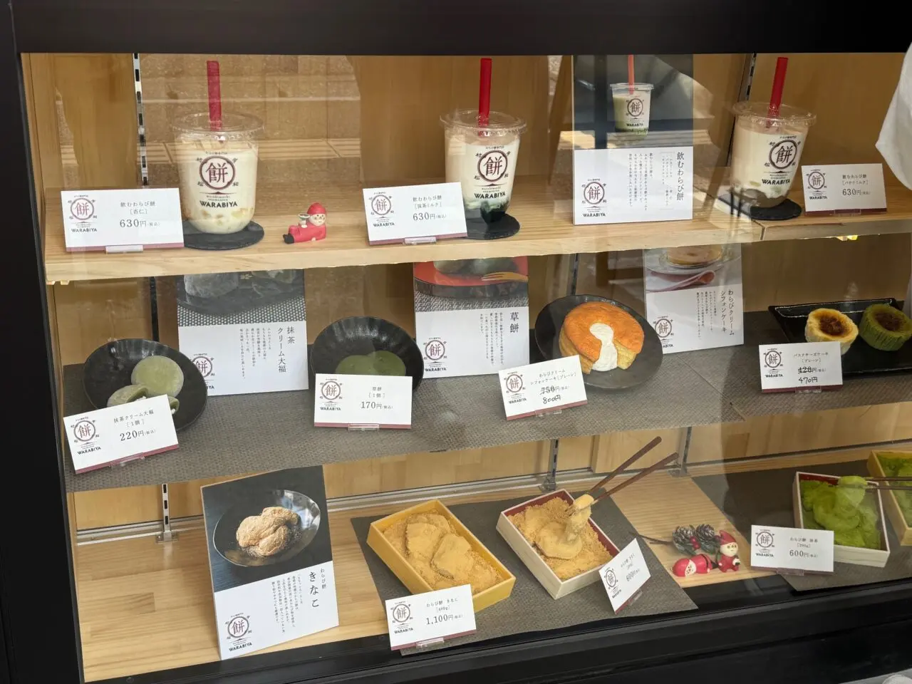 「塩豆大福」210円、「抹茶クリーム大福」220円、「草餅」170円、「わらびクリームシフォンケーキ(プレーン)」800円、「バスクチーズケーキ(プレーン、抹茶)」470円