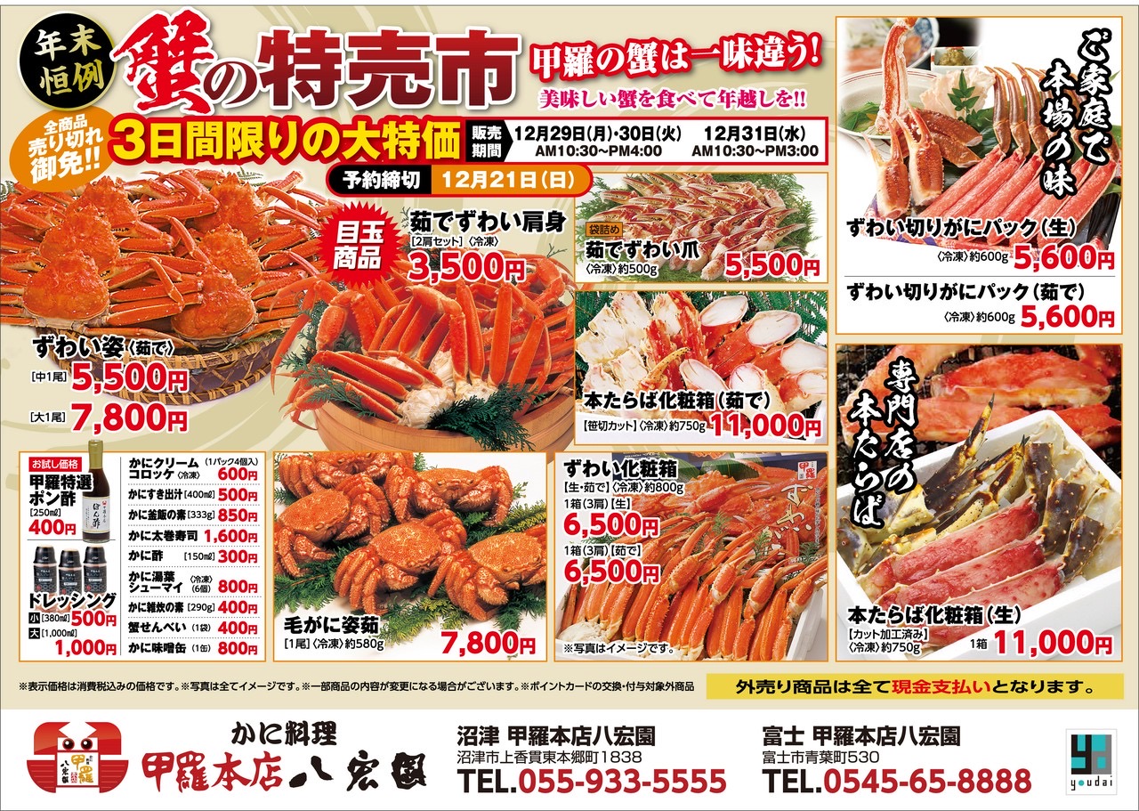 【富士市】12月29日~31日は年末恒例、お得な「蟹の特売市」です!「富士甲羅本店八宏園」