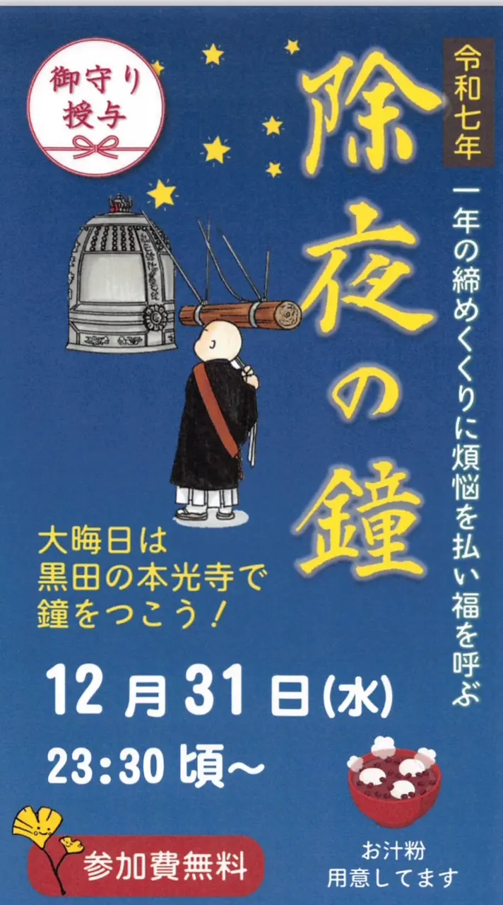 富士宮市黒田に鎮座する日蓮宗派の「鵞目山(がもくさん)本光寺」(富士宮市黒田36)では2025年12月31日の夜11時半頃より、「除夜の鐘」を開催します。