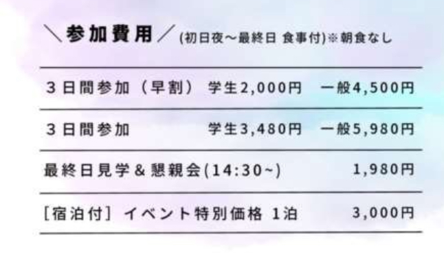 「参加費用」初日夜~最終日 食事付 ※朝食なし