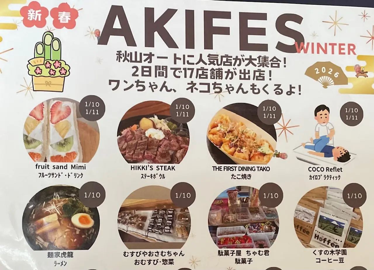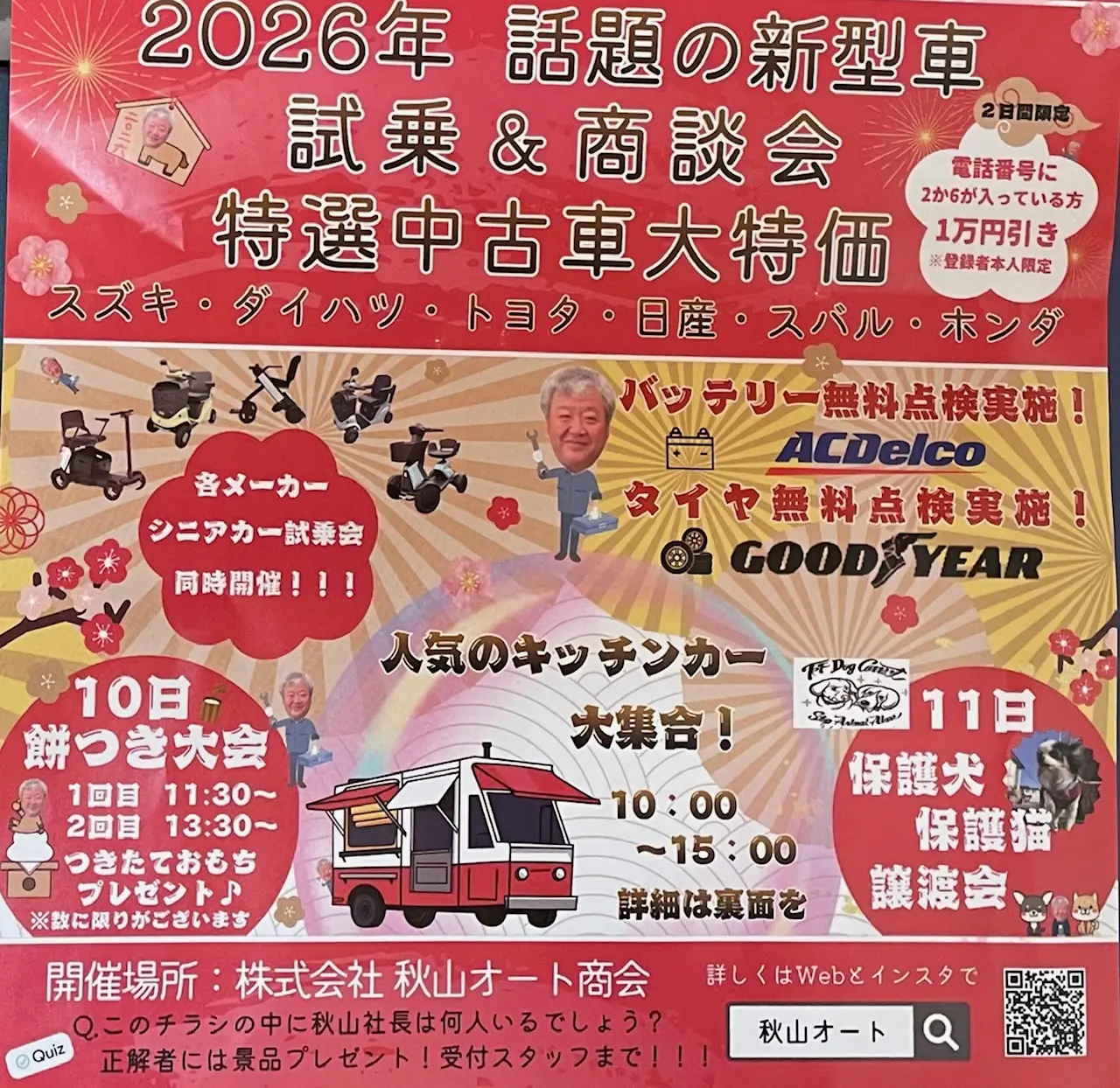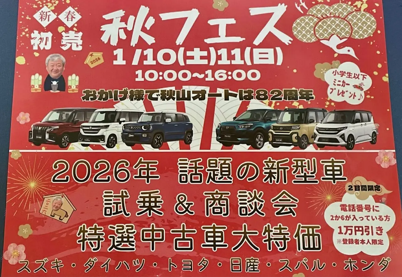 2026年1月10日(土)・11日(日)10:00~16:00「秋山オート商会」にて「新春初売 秋フェス」が開催されます。