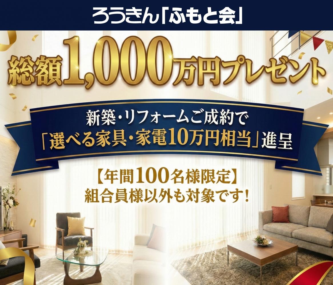 ろうきんふもと会をきっかけに住宅を建築した場合、「10万円相当の家具または家電」がサービスされる特典です。