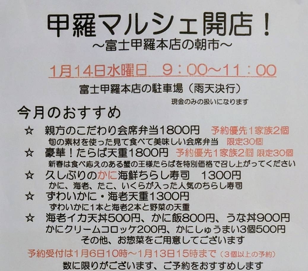 【富士市】2026年初の「甲羅マルシェ」は1月14日開催!かに海鮮ちらし寿司・たらば蟹・ずわい蟹のお弁当もあります!