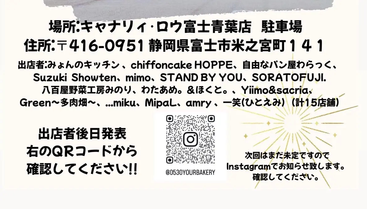 主催は「自由なパン屋わらっく」、「みょんのキッチン」、「chiffoncake HOPPE」の3店舗です。「キャナリィ・ロウ富士青葉店」の定休日に毎月開催予定です。
