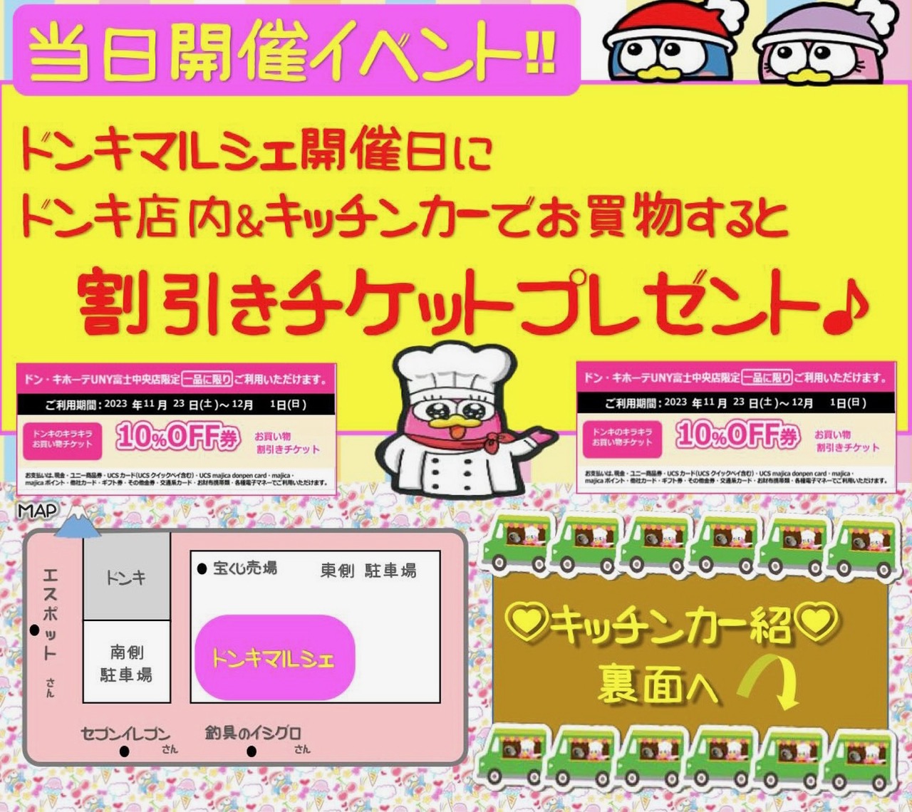②ドンキマルシェ開催日にドンキ店内&キッチンカーでお買い物すると割引チケットプレゼント。