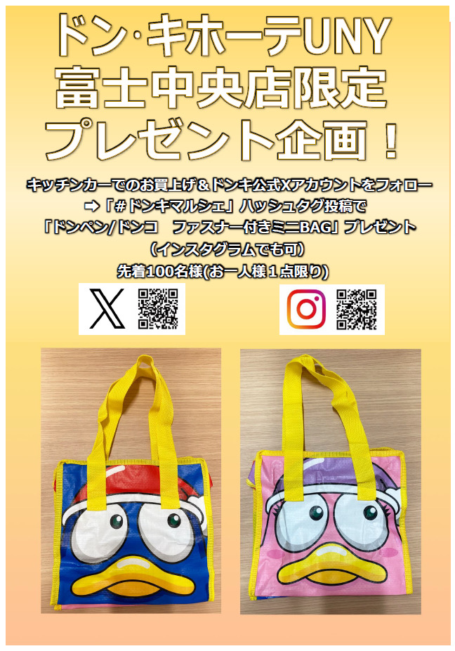 ③キッチンカーでお買上げ&ドンキ公式X or 公式インスタグラムをフォロー&ハッシュタグ「#ドンキマルシェ」で投稿すると「ドンペン/ドンコ ファスナーつきミニBAG」をプレゼント。※先着100名様。