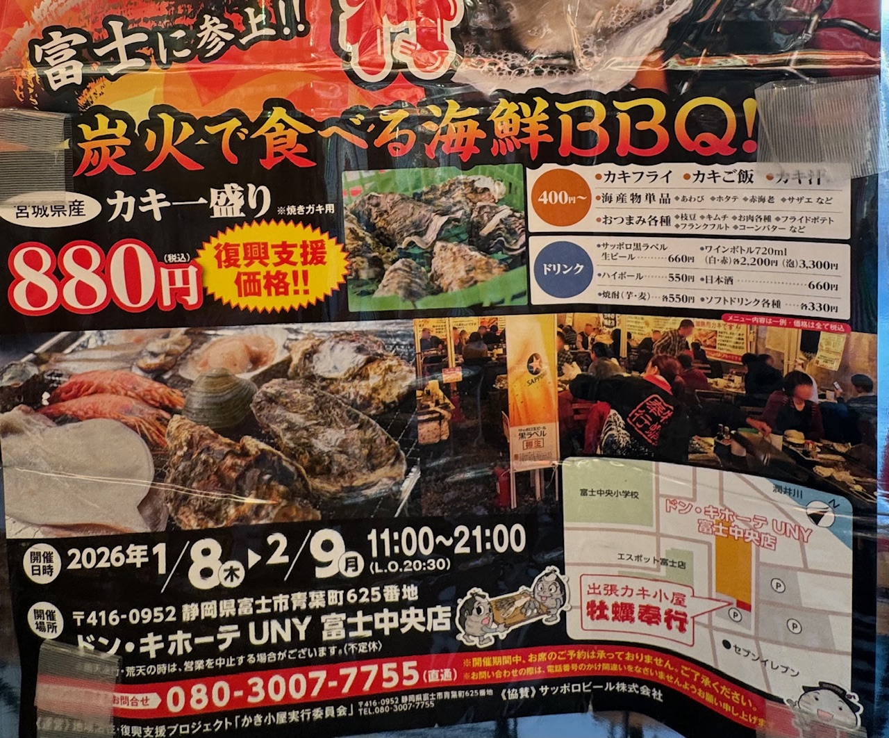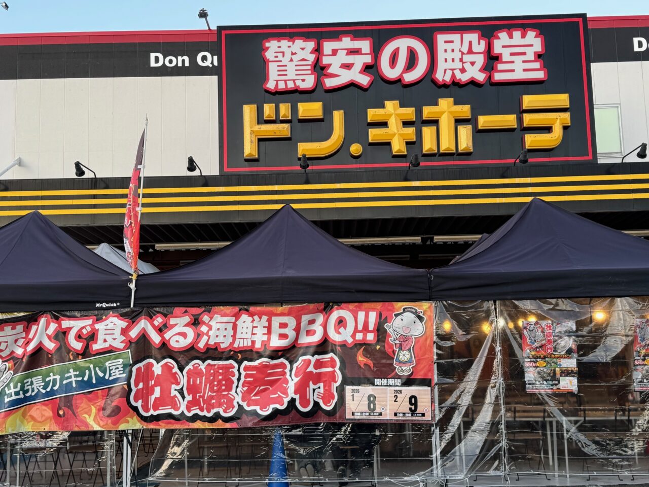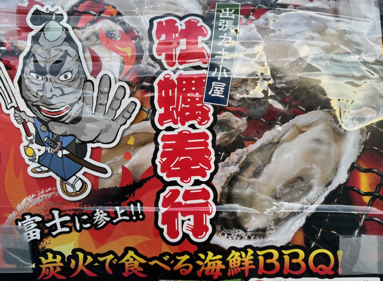 現在、「ドン・キホーテUNY富士中央店」駐車場特設会場では昨年も大好評だった出張カキ小屋「牡蛎奉行」が開催中です。開催期間は2026年1月8日~2月9日と昨年より長くなっています。