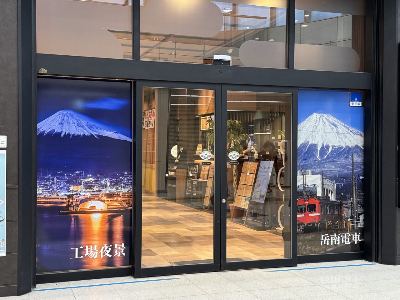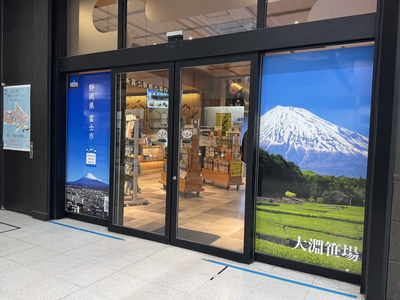 新富士観光案内所のある自動ドアには大淵笹場のパッケージ!富士市をイメージできる素敵な自動ドアに進化していました!