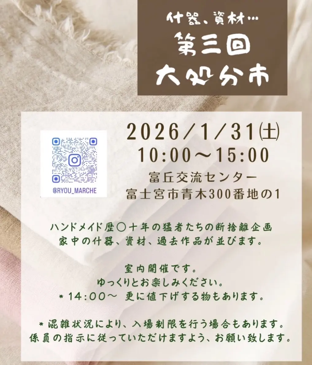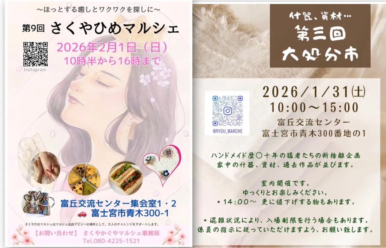 2026年1月31日(土)、2月1日(日)に「富丘交流センター」で開催されるイベント情報です。ハンドメイド作家さんの什器、資材などの「処分市」と癒しをおいしいものを探しに「さくやひめマルシェ」へ!ふたつのイベントをお楽しみください。