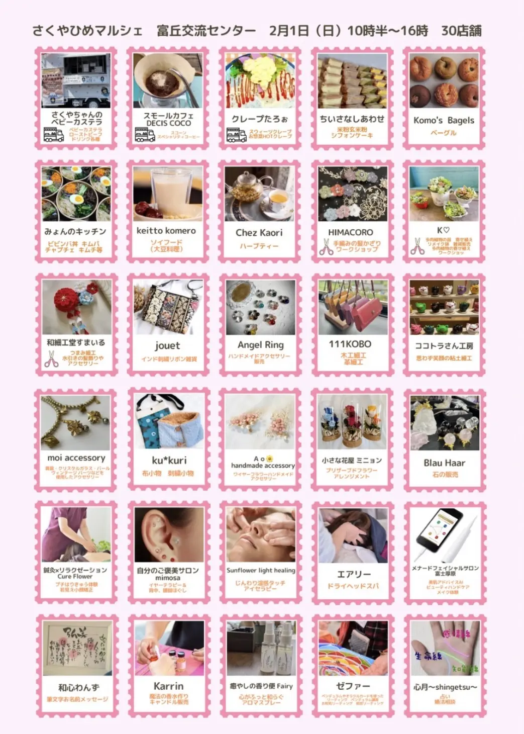 ハンドメイド雑貨、ワークショップ、占い、リラクゼーション、おいしいものの販売などあります。