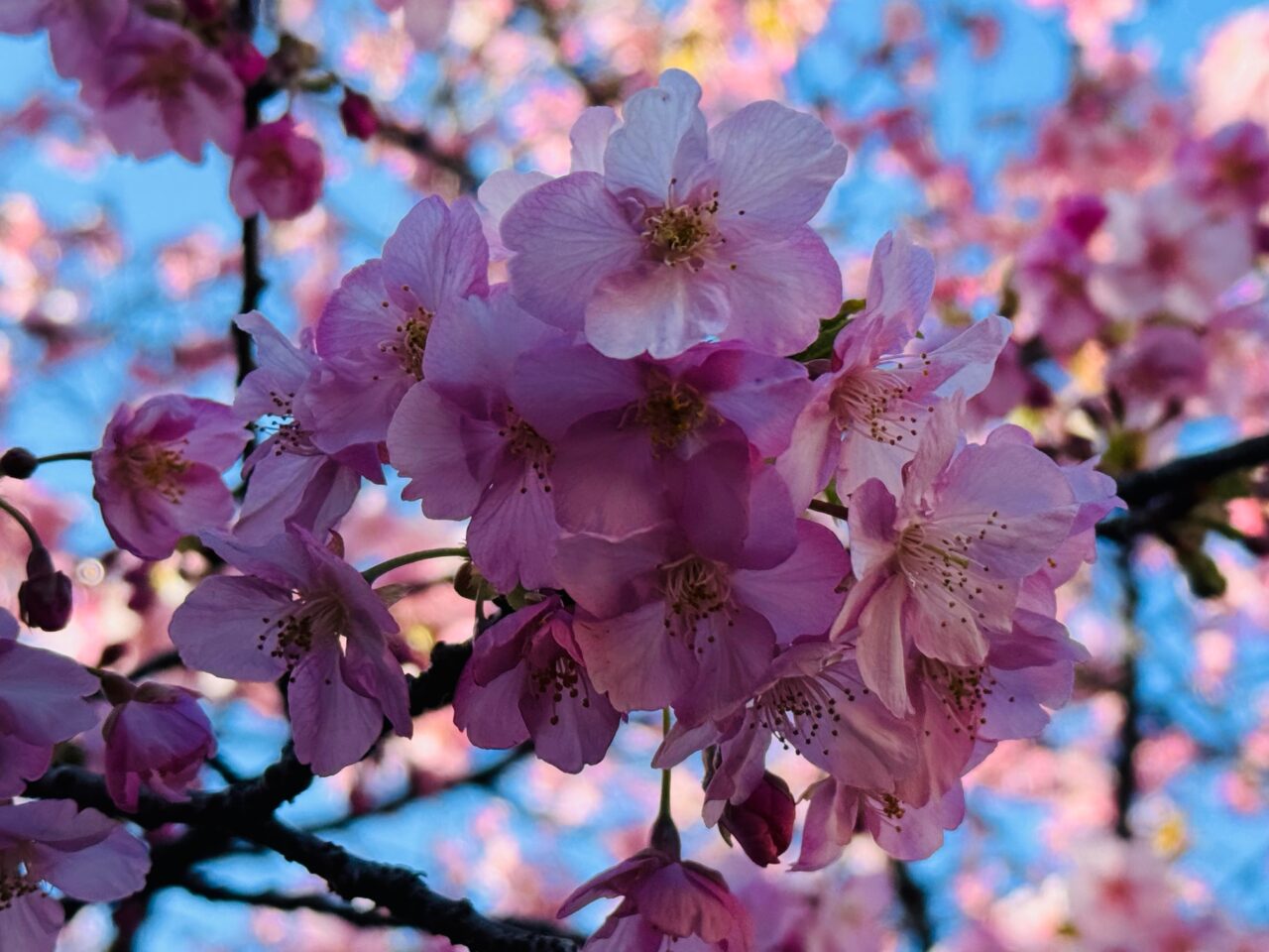 こちらの桜は河津桜より濃い色をしています。品種は不明ですが、スマホのアプリで品種を調べたところ、ヤマザクラ70%と出てきました。名前の書かれた札がないと分かりませんが、鮮やかなピンク色の桜でひときわ目立ちます。