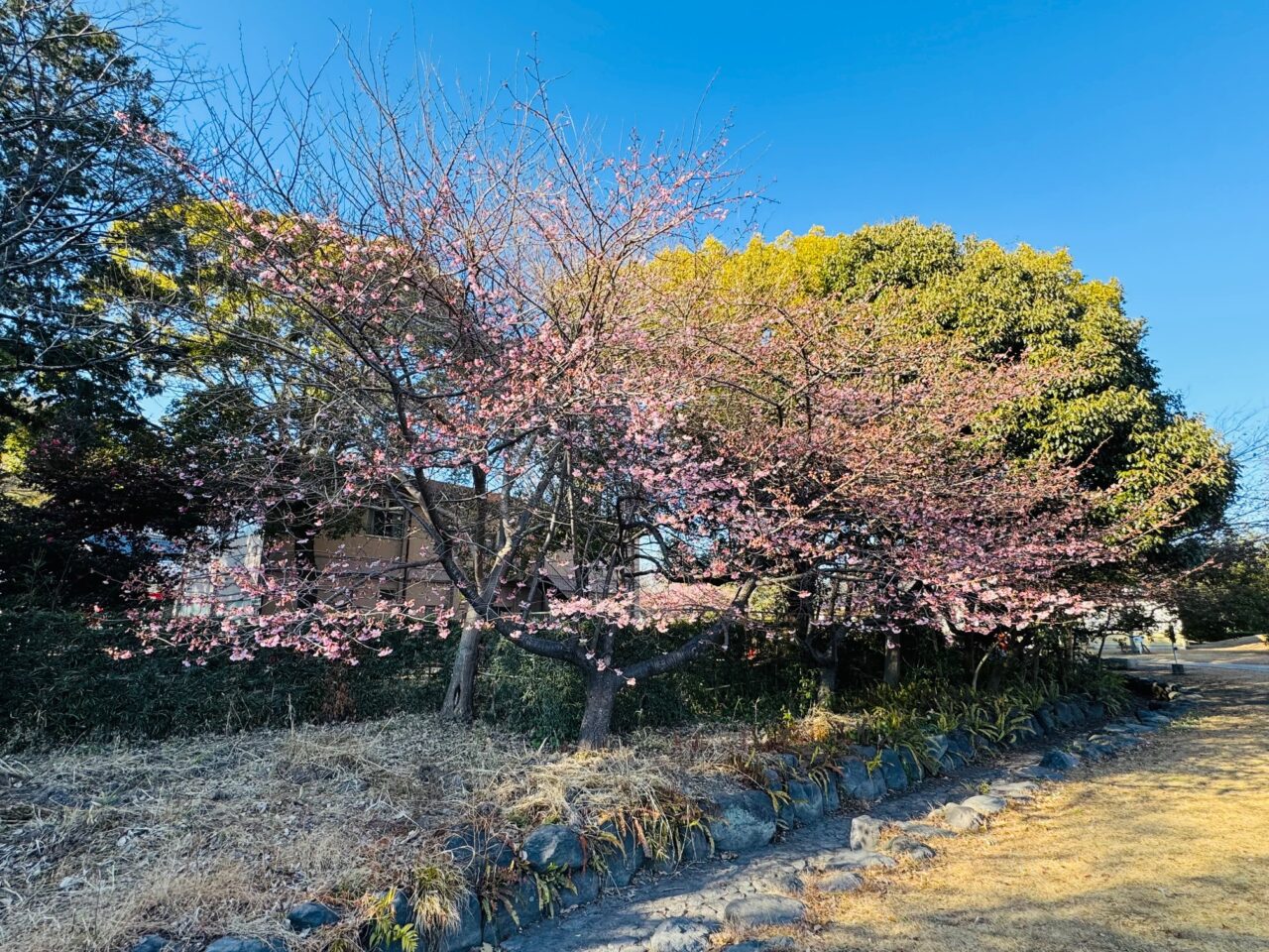 公園内の河津桜も淡いピンクが目を惹きます。