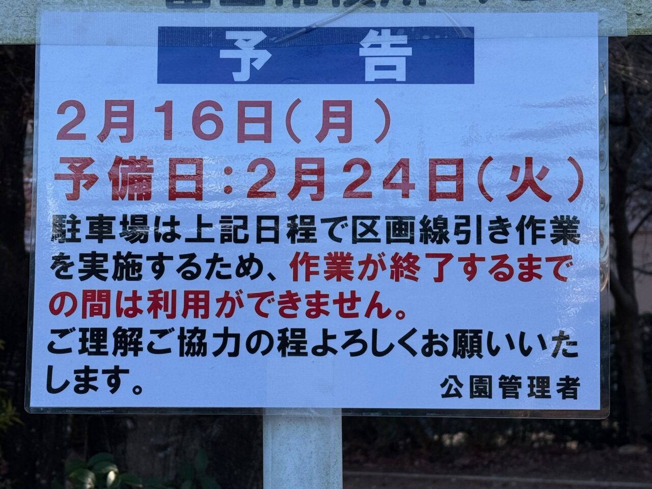 2月16日(月)には駐車場で区画線引き作業が行われますので、作業が終了するまで利用できません。ご注意ください。