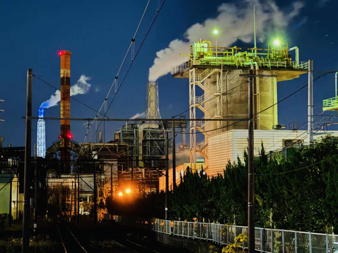 東海道線の南側から、電車の灯りとともに工場を間近に見ることができます。